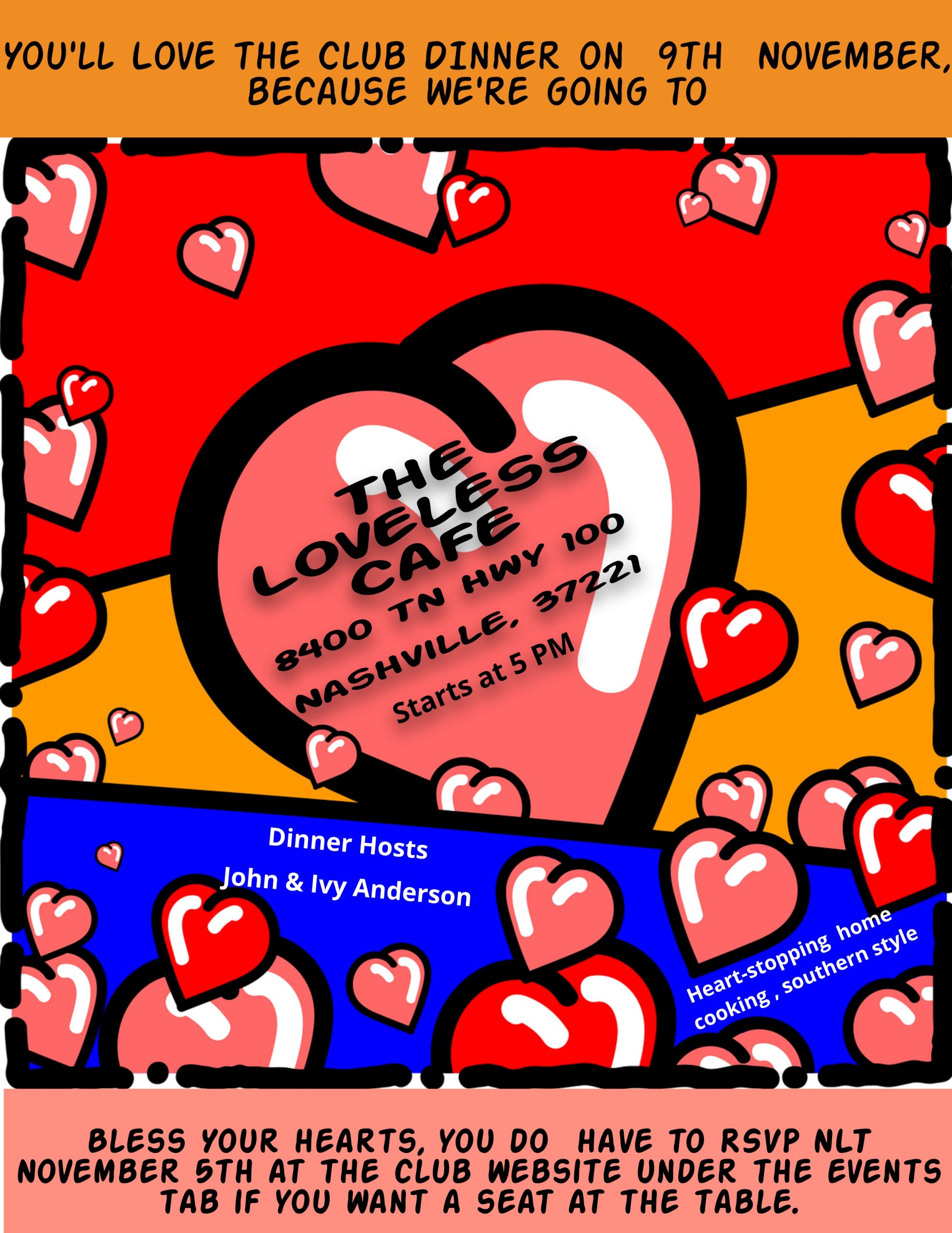 Loveless Cafe 8400 Hwy 100, Nashville, TN, United StatesClub Dinner for November 2025 will be at Loveless Cafe, on 11/9/2025, at 5:00 PM. This Dinner will be hosted by John Anderson.
