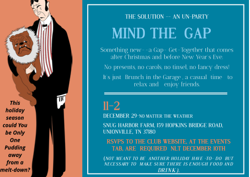 Snug Harbor Farm 159 Hopkins Bridge Road, Unionville, TN, United StatesSomethin New A Gap Get Together that Comes After Christmas but Before New Year's Eve No Cards, No Presents, No Tinsel, No Fancy Dress! It's Just Brunch in The Garage, a Casual Time to Relax and Enjoy Friends From 11 till 2 on December 29th, No Matter the Weather. Snug Harbor Farm, 159 Hopkins Bridge …