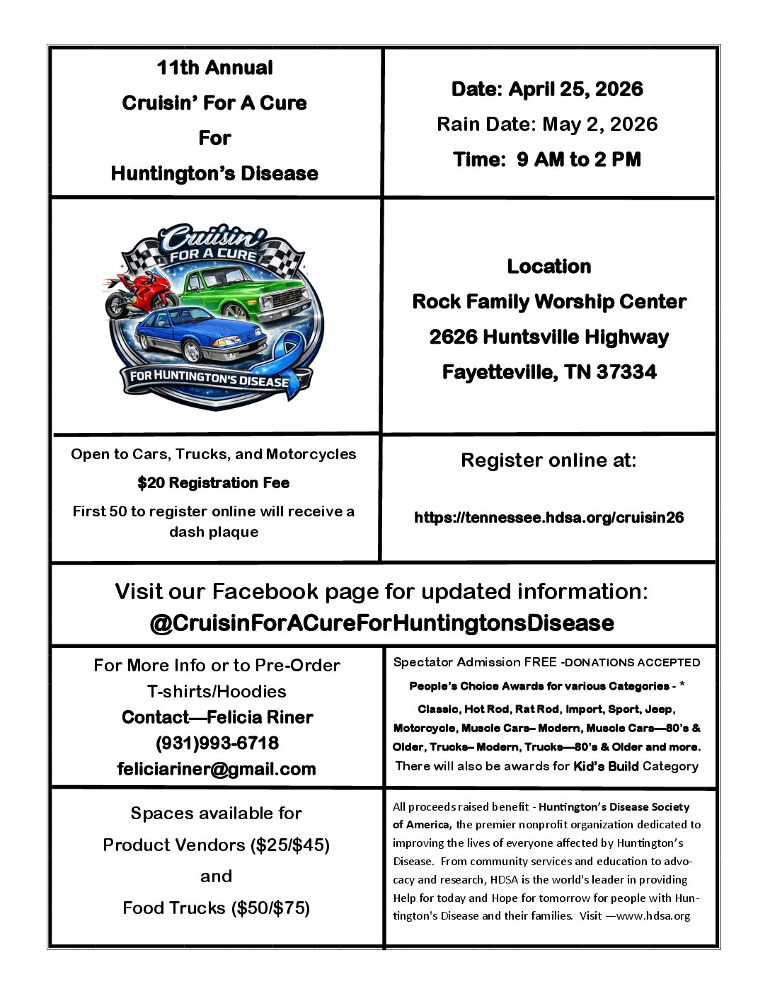 Rock Family Worship Center 2626 Huntsville Hwy, Fayetteville, Tennessee11th Annual Cruisin' For A Cure For Huntington's Disease on April 25, 2026 at The Rock Family Worship Center in Fayetteville, TN.